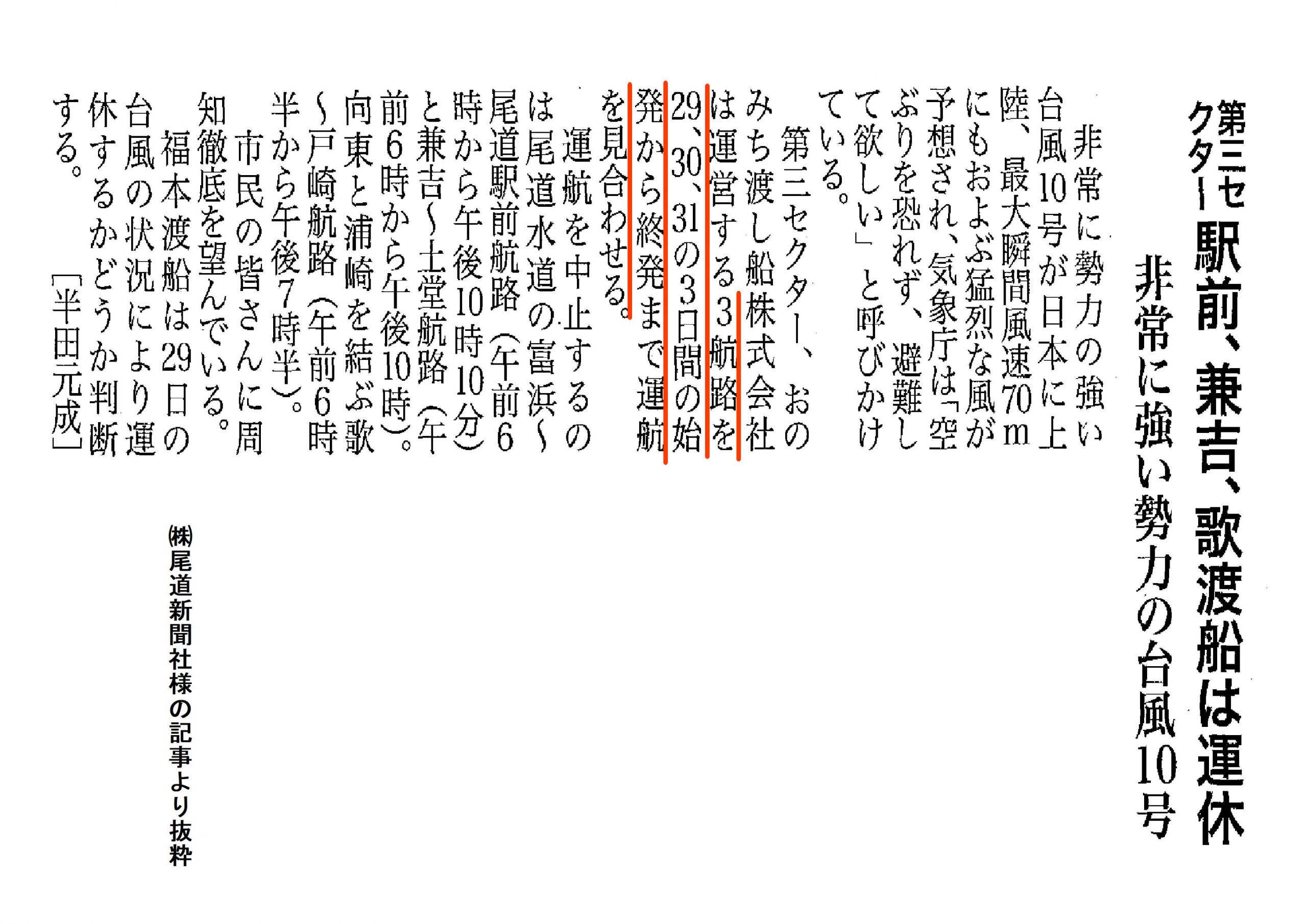本日より31日まで台風の影響により駅前渡船、尾道渡船、歌戸渡船の3航路が運休いたします。